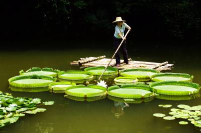三峡植物园修复三峡生态 8月24日,园林工人对既有观赏性又可保护水生态的王莲进行管理,王莲原产于南非热带水生植物,三峡植物园在自然环境下培植成功。三峡植物园针对修复三峡库区生态需要,引进、移植100多个品种湿生植物进行繁育试验,目前已有近20个品种将为修复三峡库存区生态发挥作用。文振效