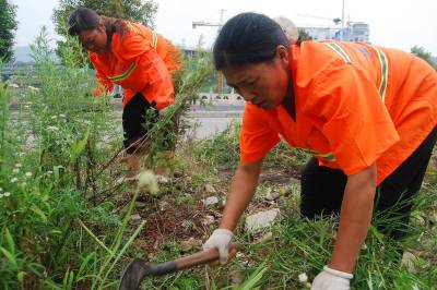 8月26日,宣恩县城区兴隆大道旁几名环卫工人正在清理路边的杂草和垃圾,这是该县为了打造山水园林城的一个缩影。