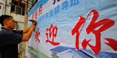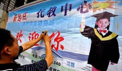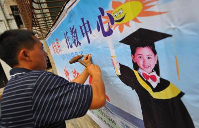 8月26日,宣恩县一“托管中心”在张贴海报招收学生。开学在即,当地一些“托管中心”也展开了争夺生源的宣传。因为按照教育部门规定,宣恩县小学生放学时间1-2年级为下午3点15分,3-6年级为4点10分。而此时众多学生家长还刚上班不久,造成未聘保姆的家庭中,学生在家长下班之前2-3小时“无人看管”的现实矛盾。“托管中心”作为一种现实需要,成为当地广大学生家长一种无奈的选择。 (本报视界网 宋文 摄)