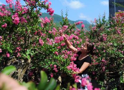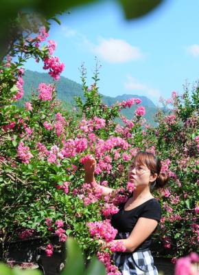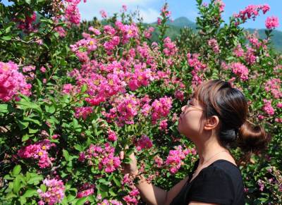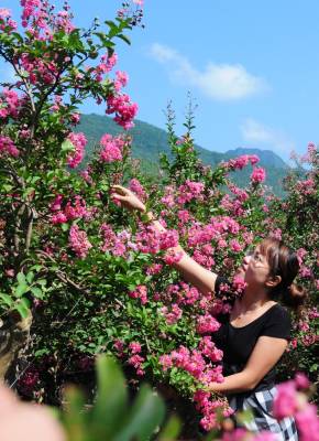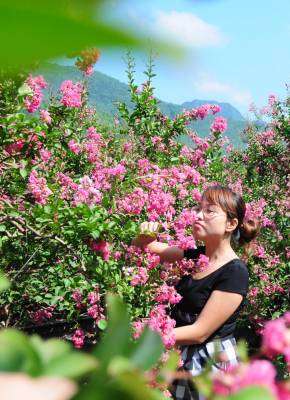 8月24日,在宣恩县山水园艺花卉基地,连片紫薇花在烈日下盛开,艳丽如霞,流光溢彩,引来行人驻足欣赏。 紫薇在花事已过的夏秋季节盛开,花期长达数月,故有“百日红”之称。 宣恩县地理位置及气候环境非常适宜紫薇生长,因此紫薇成了人们美化家园的首选花种,深受居民喜爱,全县各地种植紫薇万余株。每到秋夏时节,紫薇花姿烂漫,绮丽动人,尽情展示自己的姿韵和秀色,成为秋日宣恩乡村最美丽的风景线。 本报视界网 李以国 摄