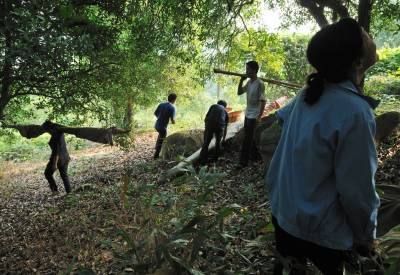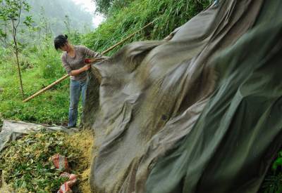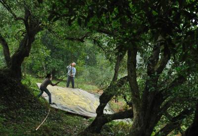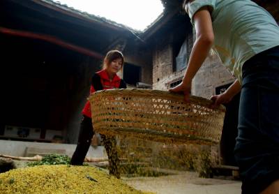 咸宁市桂花镇柏墩村是桂花之乡核心地带,山上桂花树木古老高大,树高都在八至十米之间,最高的树龄在二百年以上,该村年产桂花二十万斤。桂花收购价每公斤10元。 桂花要赶早才能打下花来。特别是早上带着露珠打,很容打落。