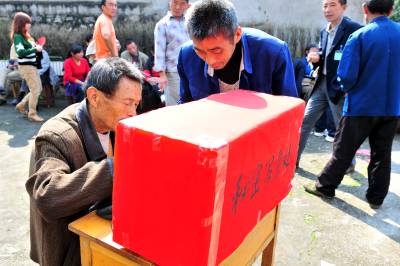 2011年9月23日是宜昌市夷陵区第八届村委会换届选举日,在乐天溪镇兆吉坪村,83岁村民陈开贵和他90岁的老伴王家秀一大早就赶到村委会认真选划投票。“咱得选一个能给老百姓办实事的当家人!”……村民们七嘴八舌议论着。兆吉坪村的整个选举过程紧张而有序,村民黄廷海以高票当选为村委会主任。