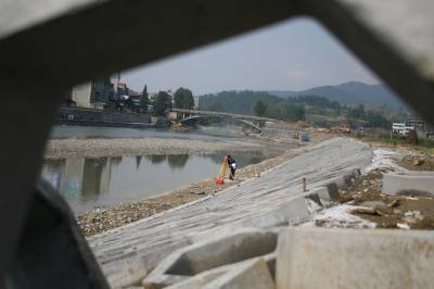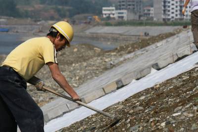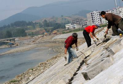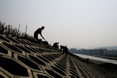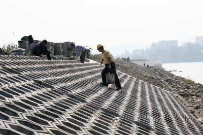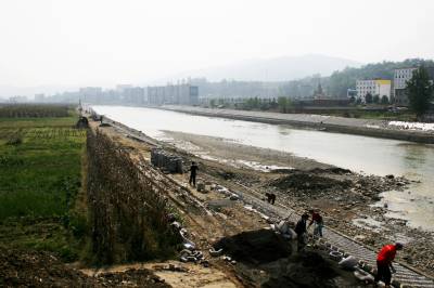 竹溪投入1800万元建生态大堤防洪保安澜 9月23日,竹溪县治理竹溪河水坪段河道施工队,正在用六角空心水泥砖块衬砌仿生态防浪堤坝护坡。为保护河堤两岸农田及居民安全,竹溪投入1800万元治理竹溪河水坪河段,用绿色景观水利堤坝和草皮护坡防洪保安澜。该治理河段长2831米,工程包括整治支流汇入口和排污汇入口各两处,新建绿色生态景观大堤。该工程工期2年,于去年冬季开工,建成后防洪能力由原5年提高到10至20年一遇。