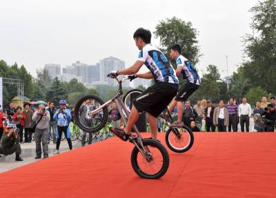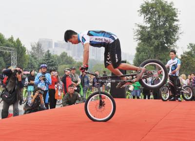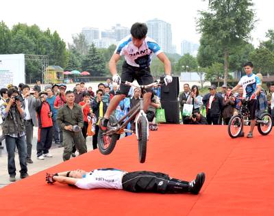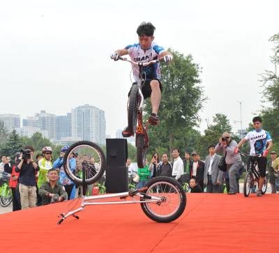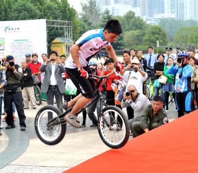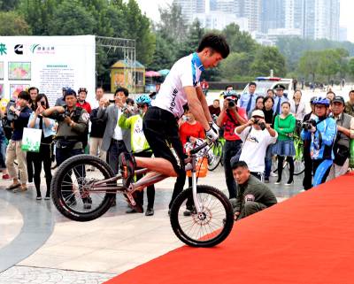 童汉芳9.22.摄 爱车友为参加武汉城市无车日活动的人们做自行车攀爬表演