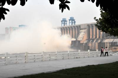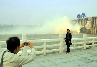 9月23日,丹江囗市的丹江囗大坝秋讯泻洪进入最后一天,从13日开始泻洪到23日共10天,拦截汉江上游多次洪峰,拦洪削峰达55%,10天中泻洪最大时开13闸孔,每日下泻10亿立方米。这次汉江上游洪水使郧西县和郧县多个乡镇转移人囗,村镇公路,水库被淹,下游分洪7000人撤离家园,汉江洪水给中下游两岸造成损失。 图为23日当天丹江囗大坝减小泻洪量时的场景。 周家山摄 郧县城管大队 电话13872840078 邮犏442500
