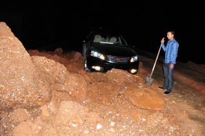 图为彭文虎的新车被滑坡碎石挡在了黑夜的国道上的情景。