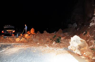9月23日凌晨2:45分,郧县小伙彭文虎从十堰市回郧县行至209囯道枊陂镇山跟前村时突遇东侧山体滑坡,当时又处在对开两车汇车使小彭的新车刹车不急冲上滑坡碎石堆上,并被前方一大块落石拦住去路把保险杜撞进去一个窝,但彭文虎因开车前行慢了几秒捡回一条命。