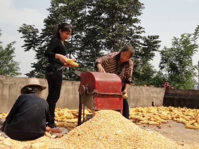 9月24日,郧县刘洞镇农家正在用脱粒机为玉米脱粒。由于秋汛期过长,抢收的农作物急需脱粒晾晒,郧县许多乡镇为农户引进小型脱粒机,潮湿农作物的霉变得到了很大程度缓解。(本报视界网 高超)