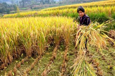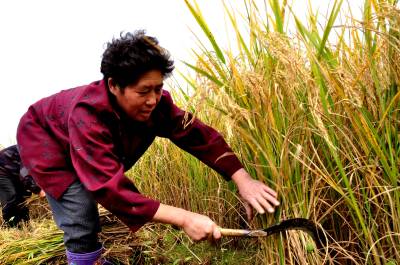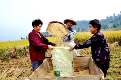 9月25日,恩施市红土乡稻池村几位农民正在“抢”收成熟的水稻,山寨田野满目金黄,一派丰收在望的喜人景象。 连日来,为确保颗粒归仓,当地广大农民正抓住晴好天气,全面动用人力和机械收晒秋季作物。 据悉,该市秋粮作物主要以生产水稻、玉米等。今夏,全市虽遭遇“旱涝”天气的影响,但秋粮仍然获得好收成。(本报视界网彭绍峰摄)