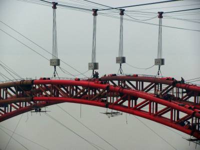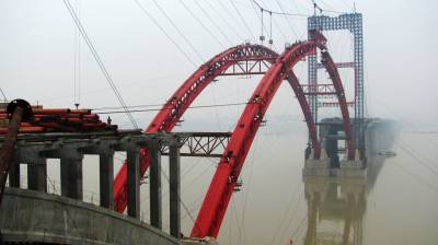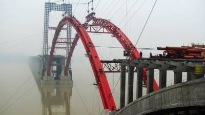 > 南水北调跨江大桥主桥钢管拱合龙(曹忠宏摄)