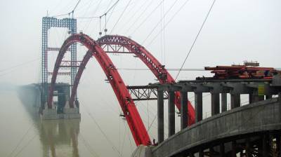 9月27日,湖北省十堰市郧县汉江二桥主桥钢管拱顺利合龙。郧县汉江二桥主桥为跨度200米的钢管拱混凝土系杆拱桥,拱肋节段安装采用无支架缆索吊装、两岸对称悬拼,总计22个吊装节段。该桥于2008年9月开工建设,是南水北调淹没郧县交通要道三门大坝的替代项目,也是南水北调丹江口库区最长的跨江大桥,引桥T梁共44跨,桥长2102米,宽18米,采用中承式钢管砼系杆拱桥桥型,项目总投资2.5亿元。该桥预计2012年5月1日正式通车。