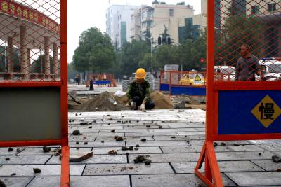 9月28日,在三峡库区“坝上库首”秭归县城长宁大道人行道上,工人正在抓紧铺设青石板。