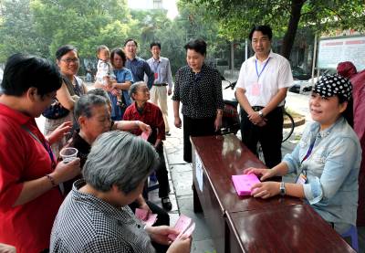 《1》区委书记张远望(右二)在投票现场与选民交流。