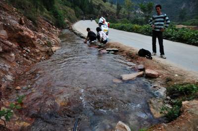 9月29日,笔者在郧县南化塘镇中原突围主战场,海拨900多米高的玉皇山顶采风后下山的路囗旁发现有一处喷泉就用柤机拍了下来。该喷泉集中在一起分几股向上喷涌,离水面高出15公分很壮观奇特,过往路人不时停下来洗个脸清爽一下,经询问当地人才知是南化塘村一组,喷泉常年喷水,附近村民用土石将流水沟拦起通上几根水管长年吃上纯真的矿泉水,据村民介绍过去这里喷出的水是温泉水,上世纪八十年代滔河上建起滔河水库后这里的水变成了凉水。郧县境内泉眼众多,在上世纪有的喷泉喷出的水达1.5米高,由于环境恶化,地下水开采严重使拍到境内的白泉,黑龙泉,白龙泉等已停上了喷涌,象南化塘村一组的这处喷泉已实属少见,应该加以保护开发旅游。