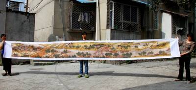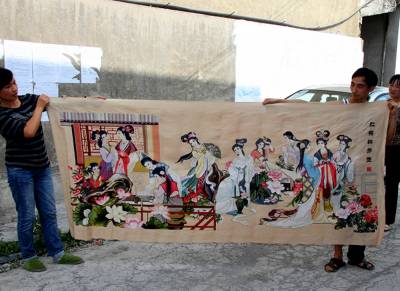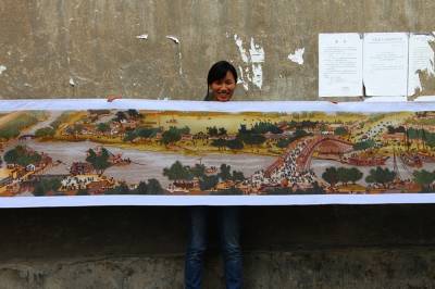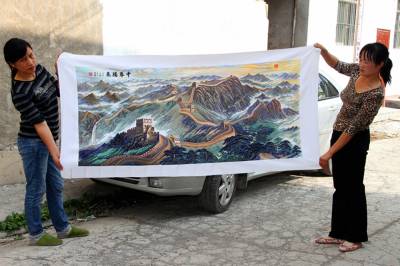 今年34岁的蓬梅英从小就喜欢十字绣,先后绣成了《红楼群芳图》、《八骏图》、《中华腾飞》等系列十字绣。2007年底,她便开始着手绣《清明上河图》,历经3年,采用了96种颜色的线,用了400万针,终于在今年9月绣成了一幅长6.16米,宽0.66米的巨幅十字绣作品——《清明上河图》。图中山水、桥梁、茶坊等应有尽有,815个人物栩栩如生。蓬梅英说,“我绣这幅十字绣的目的一方面是锻炼自己的意志,另一方面主要是通过十字绣来反映农村生活的巨变,寄托对伟大祖国的热爱,祝愿我们的国家和人民能像清明上河图一样繁荣富强,蒸蒸日上,国泰民安。” 本报视界网 李以国 李红昌 摄