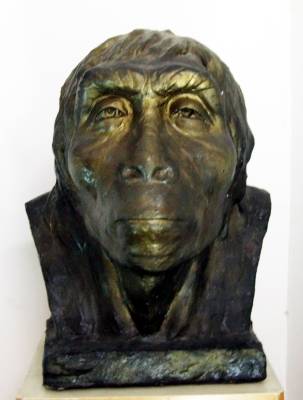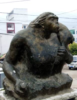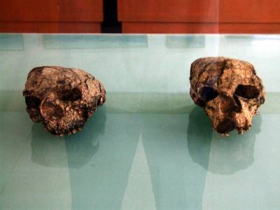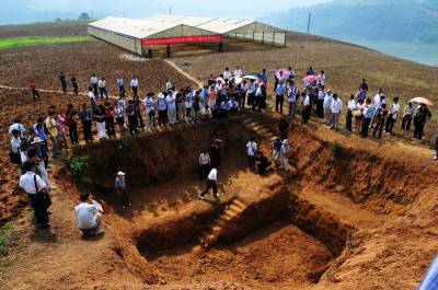 图为图为郧县人雕塑和头骨化石及国际研讨会专家在头骨化石出土现场。