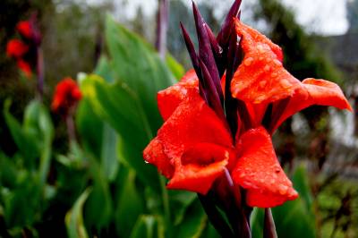 细雨过后,鲜艳的美人蕉上水珠晶莹透亮,夺目可爱。
