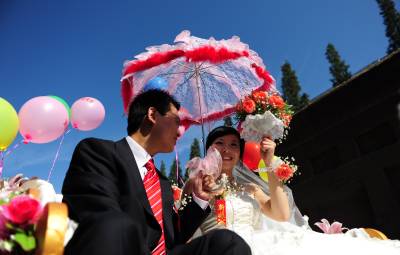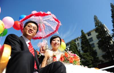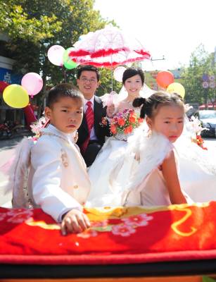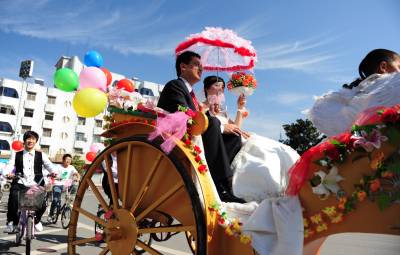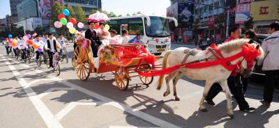 2010年10月3日,新郎葛雪华、新娘王娟乘坐马车在潜江市街头巡游,举行“低碳”婚礼。 当日,来自河南的葛雪华在湖北潜江市迎娶新娘王娟,新人坐在别致的马车上,新娘的亲友骑着自行车追随其后,环城巡游举行“低碳”婚礼,在别样的浪漫氛围中喜结良缘。