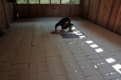 渐行渐远的民间造纸术,湖北省利川市毛坝乡的彭茂亮今年46岁,他己在这大山沟里当了25年的舀纸匠, 彭茂亮告诉说造这种纸总共有七十八道工序。