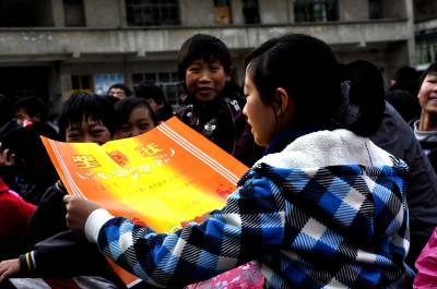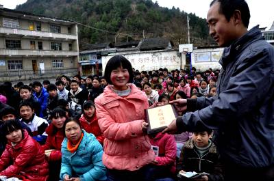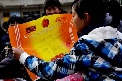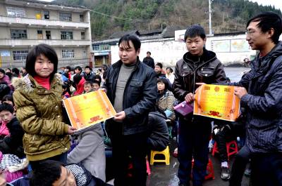 留守儿童的“奖状” 11月18日,在恩施市红土乡石灰窑中学操场上,老师正在给“品学兼优留守儿童”颁发奖状和奖品。 近几年来,该校开展“关爱留守儿童”活动,让所有远离父母的孩子心有人爱、身有人护、难有人帮。通过评选表彰品学兼优留守儿童,让全校280多名留守儿童学有榜样,健康成长。今年九年级毕业生中,一名留守儿童以优异的成绩考入到了恩施高中,受到社会好评。(本报视界网彭绍峰摄)