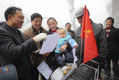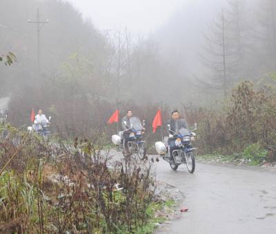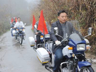 “养老保险是大事,及时参保最明智......”“生活质量要提高,控制人口很重要......”“每月节约几元钱,合作医疗保一年.......”11月17日,建始龙坪乡送政策轻骑摩托车队冒雨从乡政府出发,行驶在姜家坪、铁厂坝村路上,一路上,车载喇叭不停宣传着党的各项惠农政策,进村入院落,队员及时开启喇叭(图四),将随身带的城乡居民社会养老保险、新农合等惠农政策资料分发给群众,并耐心细致讲解宣传起来。