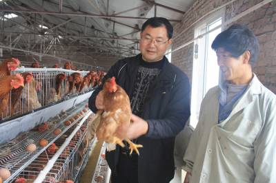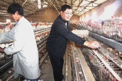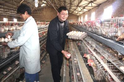11月19日,县政协委员、竹山县城关镇桥儿沟村农民张洪武正在新建的5万只养鸡示范场里收获成品鸡蛋。2010年,他返乡回村后先后投资500万元,自主创业创办了竹山县唯康养殖有限公司,发展规模养鸡5万只,集土杂鸡、蛋鸡种源繁育、生态养殖、饲料加工、技术推广、销售为一体的综合性养鸡示范基地,年实现销售收入500多万元。目前,近两年,该县已建成了120个标准化养殖小区和养殖示范场,已有6000余名返乡农民工成功自主创业,带动就业2万余人,为农民增收起到了示范带动作用。