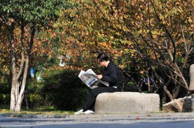 武汉秋日的宝岛公园内,一位市民正静静地在太阳下看报。