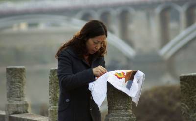 11月19日,宜昌市夷陵区一市民利用周末在黄柏河畔刺绣。近年来,该区人民不断丰富自己的业余文化生活,一些大姑娘、大妈、大婶们,在繁忙的工作之余,走出家门,在公园里、黄柏河畔,用手中的绣花针、五彩线绣出了夷陵多姿多彩的生活。本报视界网 周建平 摄