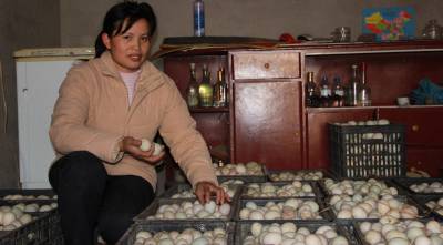 11月20日,安陆市王义贞镇杨港村3组农民周金秀正在饲养鸭群和捡鸭蛋。据介绍,该市在湖北神丹公司的技术支持和资金扶持下,全市参与养鸭、养鸡的农家女达到1350余名,养殖总规模超过1000万只,年加工禽蛋800万枚,农民年创收突破亿元大关。(签约摄影师:王代金)