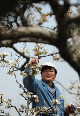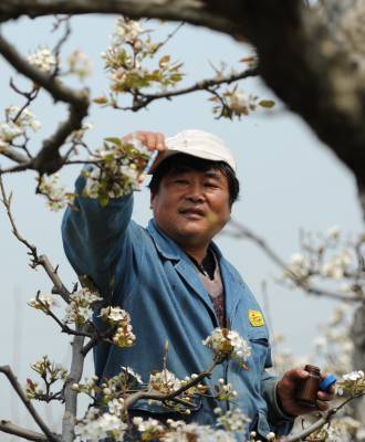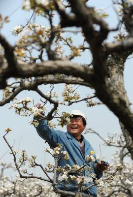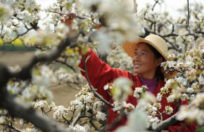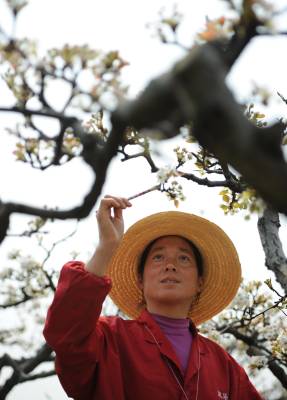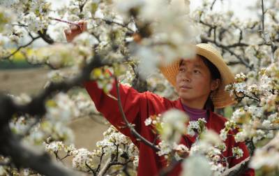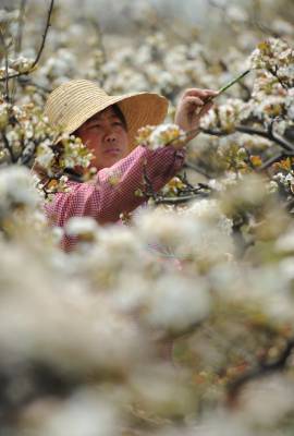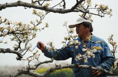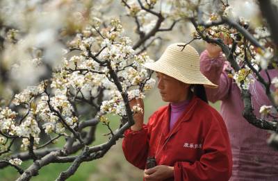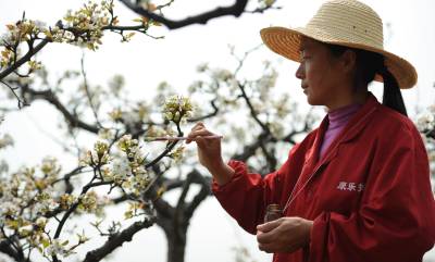 4月1日,潜江市后湖农场果农在梨园给梨花授粉。清明时节,湖北潜江市10000余亩梨花竞相开放,果农纷纷趁着晴好天气进行人工授粉。他们手执毛笔、铅笔橡皮等器具蘸粉逐花涂抹,在花海描绘春天
