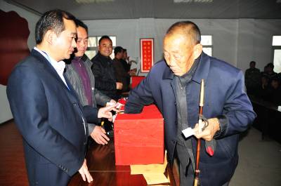 图8985号为李老汉接过公证员递过来户主姓名单时的情景。 图8987号为李老汉来到前台将手伸进分房箱抓新房时的情景。