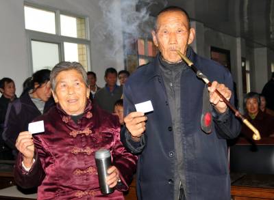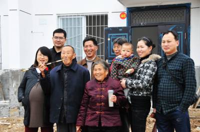 11月21日,郧县谭家湾镇十方院村83岁老汉李志淸一大早和80岁的老伴裴秀英来到村委会等侯分移民内安新房,李老汉已是四代同堂共有24囗家人,今天村上分配第二批127户445人的移民安置房,他与大儿子今天代表家人前来抓号。上午9点正式开始分房抓号,李老叼着长烟袋坐在椅子上耐心的等候,10:10分公证员终于抽到并叫到了4组李老汉的名字,李老汉来到前台将手伸进分房箱抓出一个信封,公证员撕开为190号2层新房,房屋面积168平方米,比他一层旧房多了近100平方米,老俩囗来到山上新区找到了190号新房,房前房后都是衔道老俩囗感到很满意,随后老俩口又来到大儿子家46号房并与回来的儿孙们在门前合照了一张相。因南水北调中线工程郧县谭家湾镇十方院村共有244户809人在月底前全部搬进新房,11月23日第二批127户445人的移民将搬进新安置房开始新的生活。
