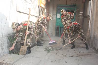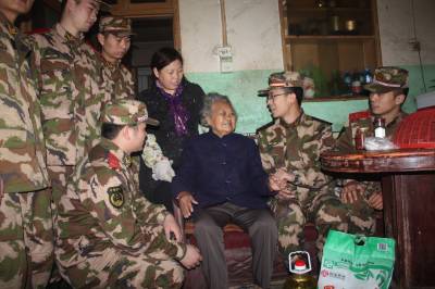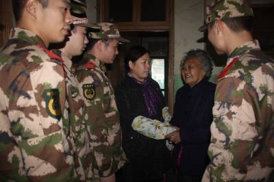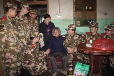 21日,武警二支队五中队组织面临复退的老兵,走进武昌北环路社区,来到83岁孤寡老人吴梅枝家,为老人送来大米、油等,官兵们陪她拉家常、嘘寒问暖,听她讲过去的故事,并交流了当兵的经历,宣讲十七届六中全会精神。当日,他们还挥镐抡锹为社区清除生活垃圾,积极用实际行动为第二故乡做贡献。
