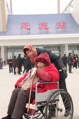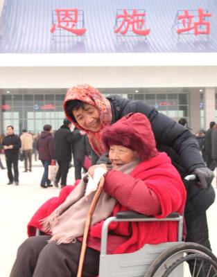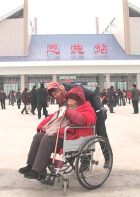 百岁老人的夙愿 2010年12月22日上午,宜万铁路开通运营仪式在恩施火车站一站台举行。大清早,恩施舞阳坝97岁的谭定贤老人,在儿媳的帮衬下坐轮椅来火车站看火车。站内,飞出欢庆的锣鼓声,老人听得到却看不到,于是孝顺的儿媳便俯身贴到在老人的耳旁;“娘!火车今天通车了!”,百岁老人开心的笑了;“好喔!娘听到了!” 武汉铁路局襄阳机务段 熊德明摄(TEL 13797581610)