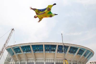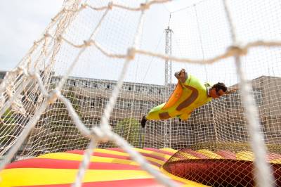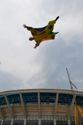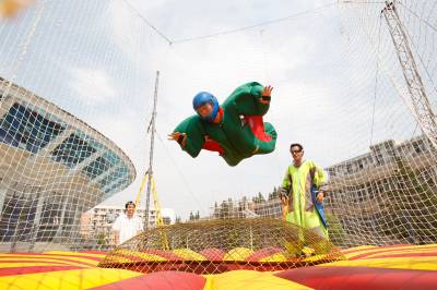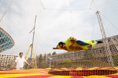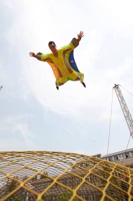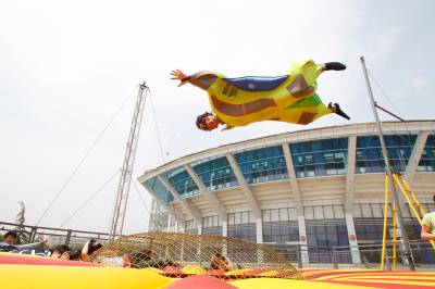 2010年5月24日,亚洲首个移动娱乐风洞亮相华中科技大学武昌分校,这个风洞由该校和法国“飞人”弗兰克·巴赞共同研制,该风洞可用拖车运送到任何场地组装。图为弗兰克现场展示了“娱乐风洞”的飞行技巧。“娱乐风洞”是通过人工制造垂直向上气流的设施,当垂直气流达到一定的速度,人以一定姿态进入气流,不需任何工具就能飘浮起来。