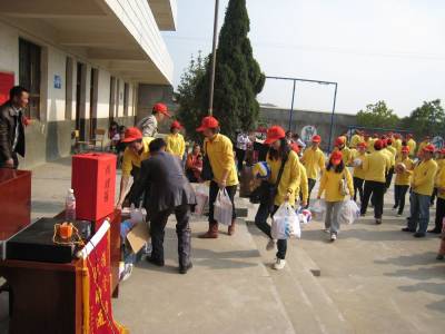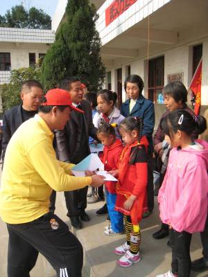 是日上午9时许,武汉万达地产公司70多人分乘两辆大巴车来到山口小学。员工们在孩子们和村民的热烈欢迎中,缓缓走进了校园。捐赠仪式上,万达地产公司总经理赵毅代表公司把5600元爱心款分别赠给严福金等7名特困生,他个人另捐款1000元。公司员工纷纷解囊捐款9068元,作为该校今后特困生助学激励基金,并捐赠了价值3000多元的文书学习资料及文体活动用品。