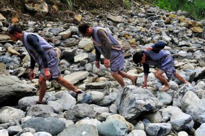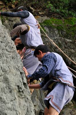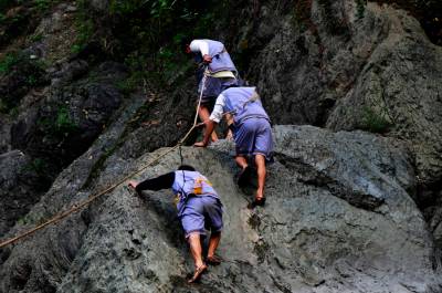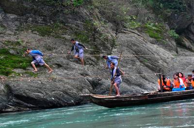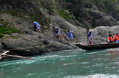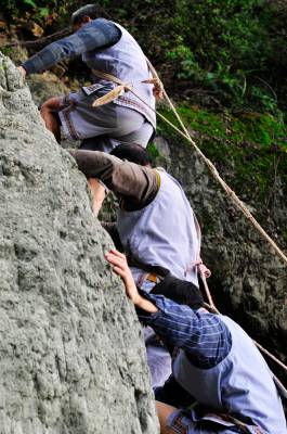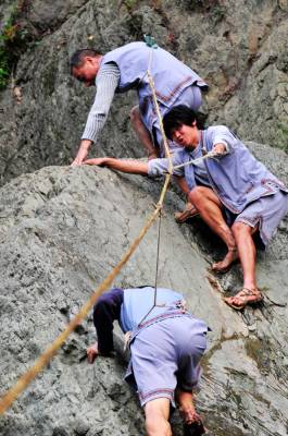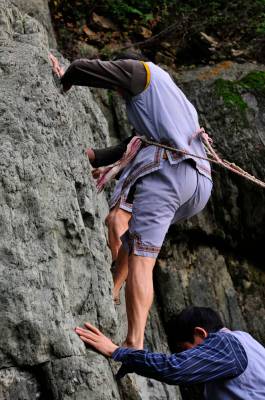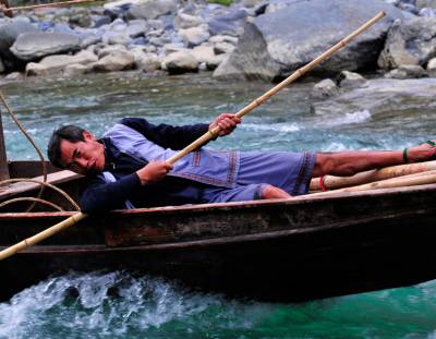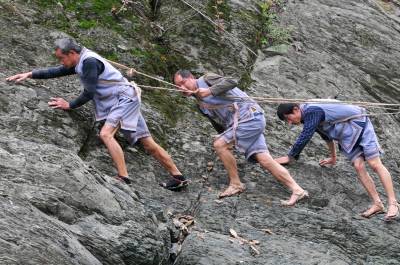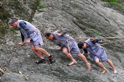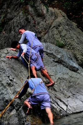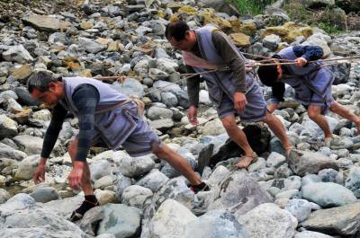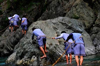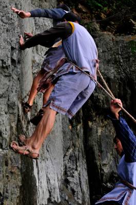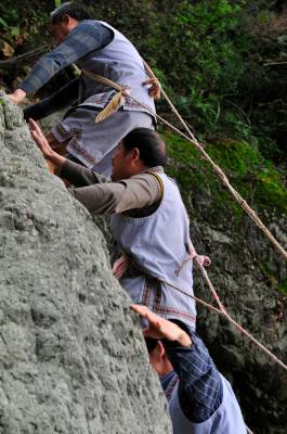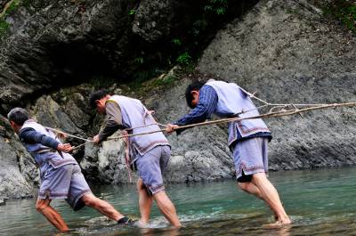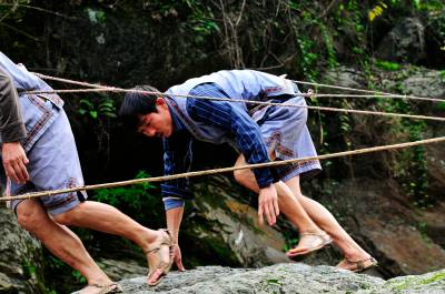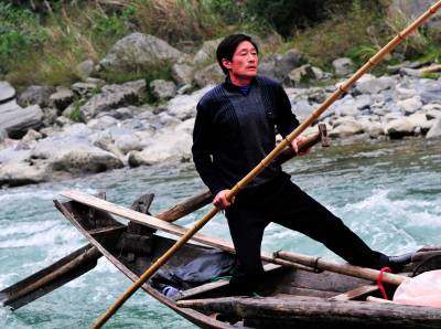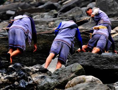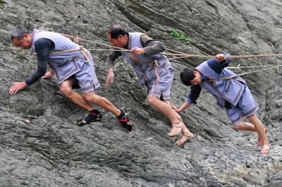 2011年11月24日,湖北省巴东神农溪深谷里,纤夫拉着“弯豆角”木船,沿着“纤路”艰难地前行。“三尺白布四两麻,脚蹬黄土手刨沙,”这是纤夫艰辛的真实写照。川鄂长江激流险滩上的纤夫,历来豪放朴实、果敢尚义、爱喝烈酒。其缆绳取最好竹子划出的竹青编成,靠上好的“白官布”制作而成的搭肩。逆水而上时,纤夫腰成满弓,纤缆如弦,在陡峭山岸上手抠岩缝,赤脚草鞋寻找水石里的抗争支点,汗珠摔成八瓣,胸腔挤压出“嘿佐”的号子,每向前一步都要经几拼搏。