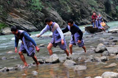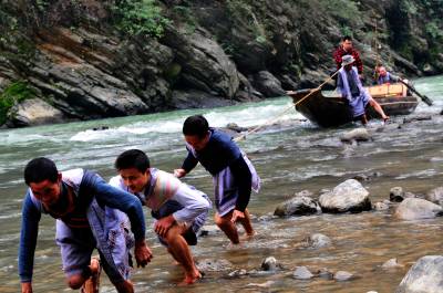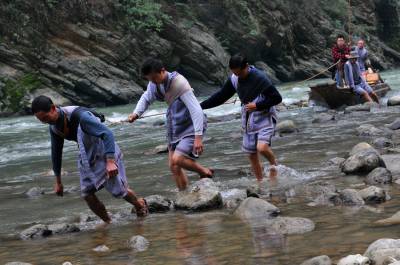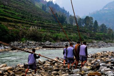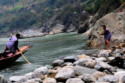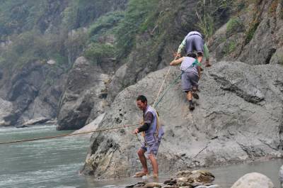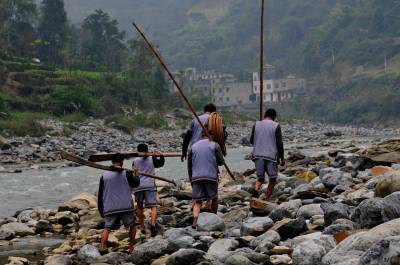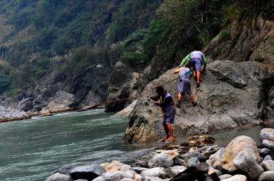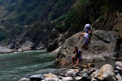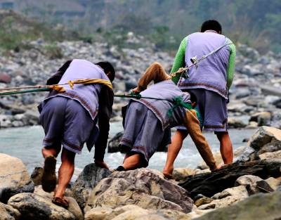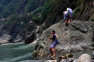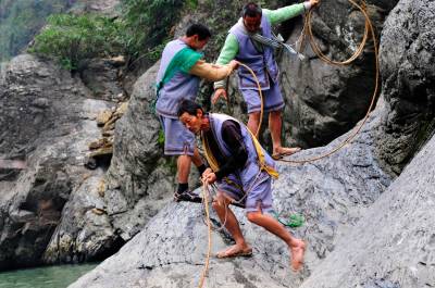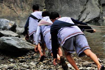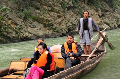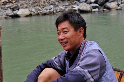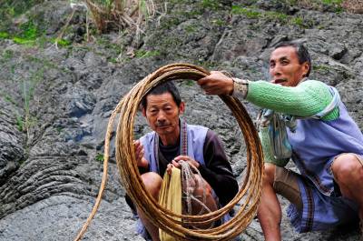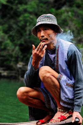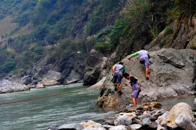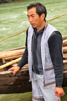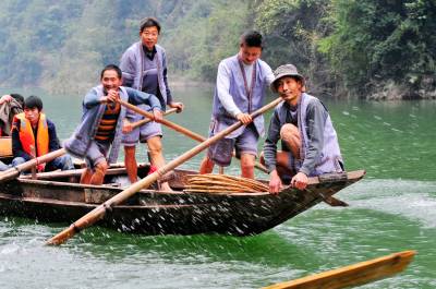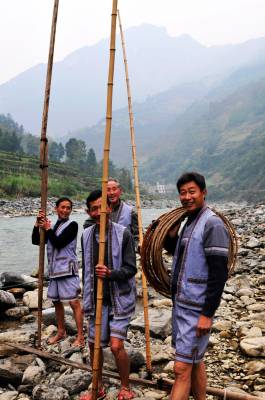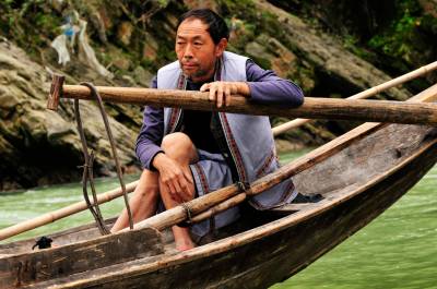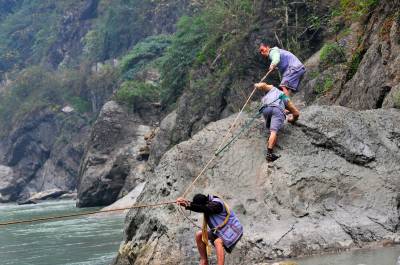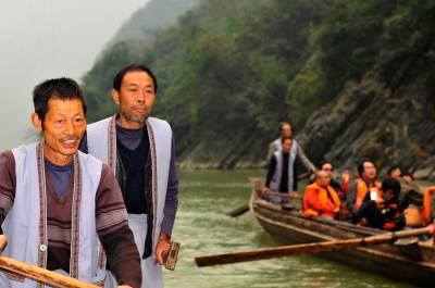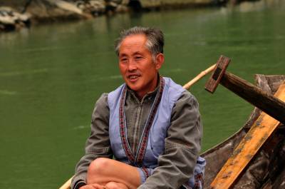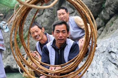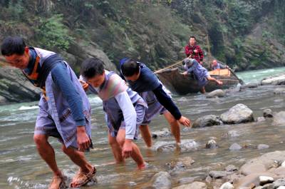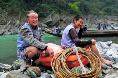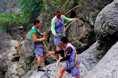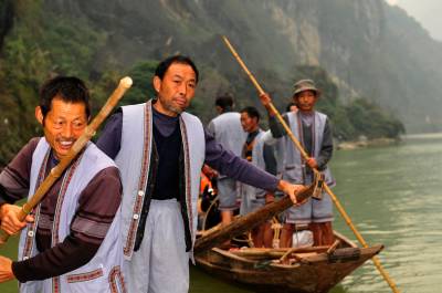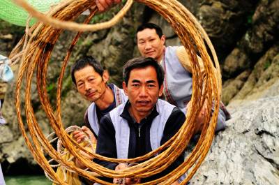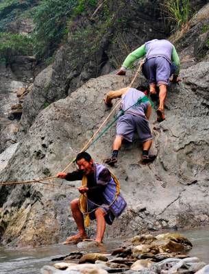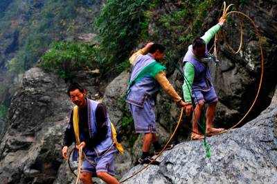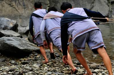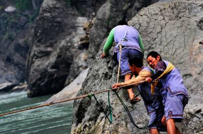 2011年11月24日,湖北省巴东神农溪深谷里,纤夫拉着“弯豆角”木船,沿着“纤路”艰难地前行。“三尺白布四两麻,脚蹬黄土手刨沙,”这是纤夫艰辛的真实写照。川鄂长江激流险滩上的纤夫,历来豪放朴实、果敢尚义、爱喝烈酒。其缆绳取最好竹子划出的竹青编成,靠上好的“白官布”制作而成的搭肩。逆水而上时,纤夫腰成满弓,纤缆如弦,在陡峭山岸上手抠岩缝,赤脚草鞋寻找水石里的抗争支点,汗珠摔成八瓣,胸腔挤压出“嘿佐”的号子,每向前一步都要经几拼搏。