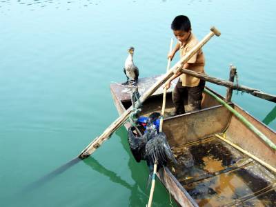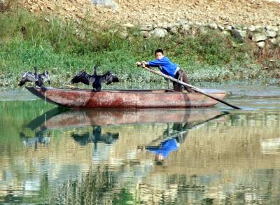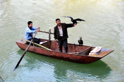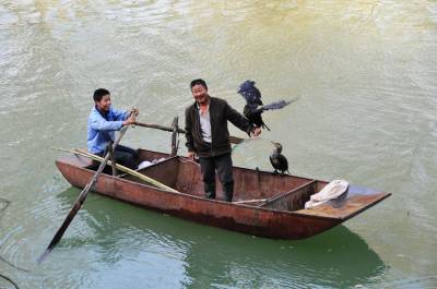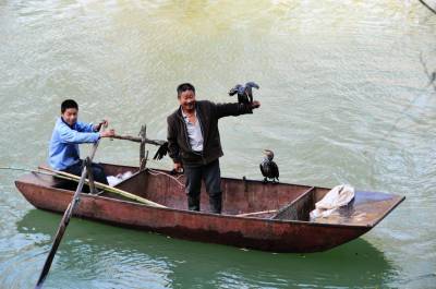 11月28日,笔者在郧县梅铺镇时家沟村看到一对父子正划船在滔河里用3只鹭鸶捕鱼,老汉叫郑国昌已用鹭鸶捕鱼有20多年历史,郧县镜内汉江段有135公里,丹江,堵河,滔河河流众多,鹭鸶捕鱼历史悠久,而今江面上已看不到鹭鸶捕鱼了,郑国昌至今还在用鹭鸶捕鱼成为河面上的活字典,更代表渔民捕鱼的一种传统文化。 图为郑国昌正在滔河船上演示训化的鹭鸶时的情景。 周家山 摄 郧县城管大队 电话13872840078 邮编442500