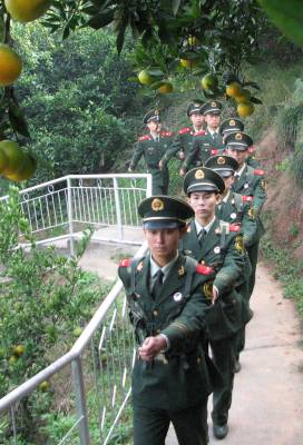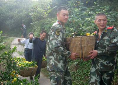 漫山遍野万倾柑橘芳香四溢,黄橙橙的香橘爆满枝头,让人垂涎欲滴,好一派丰收景象!武警宜昌市支队城区某中队就驻在果农千亩橘山脚下。一条哨路穿园而过。战士们千百次上哨下哨常常是头顶黄橘,目迎橘香,但没有一名战士违反纪律,偷摘果农一个橘子,反而当起了果农利益的保护神。 图1:哨兵在执勤上哨途中,面对喜结硕果的金秋香橘,做到文明执勤,秋毫不犯。 图2、3:爱民新风,催熟金秋橘香!驻地果农橘林喜结硕果,官兵主动前来帮助果农摘收果实,抢时上市。 夏红胜 摄