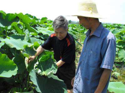 庄稼医生诊藕病 2009年6月15日,汉川市麻河镇优质莲藕生产协会会长、科技馆馆长卢秀清同志,深入到该镇胡郑村3组的田间地头,对该村植藕大户胡树生的莲藕田进行配方施肥技术指导,确保莲藕增产增收。 图为卢秀清正在告诉胡树生如何结合防治莲藕腐败病进行配药早防早治的情形。 (汉川2009摄)摄影师 邹开建通联:汉川市信访局电话:13197382491