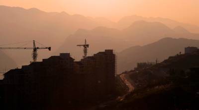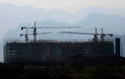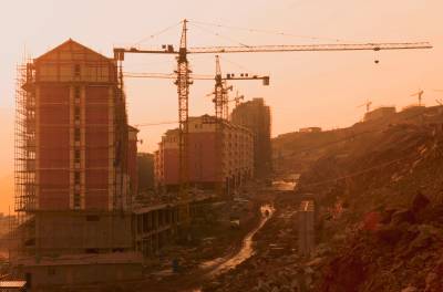 12月12日,三峡库区巴东县神农溪小区铜鼓组团建设工地塔吊正在作业,工人们在筑造木模。