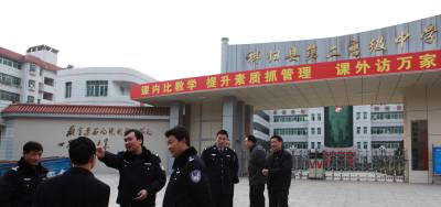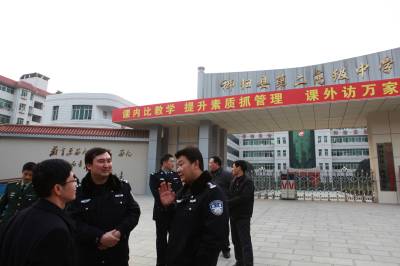 图四:公安局长(右二)、分管交通的副局长(右一)在一学校调研“人”、“车”分流的运行准备情况。