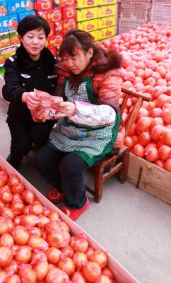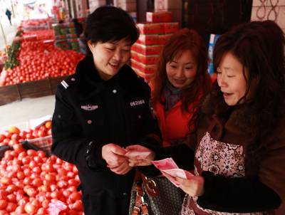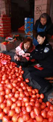 12月15日,秭归县公安局一女警采取先讲解后测试的方法,向设点销售柑橘的果农传授识别假币的知识和技巧。秭归县是全国知名的柑橘之乡,在柑橘销售全面提速之际,秭归县公安局开展覆盖所有柑橘销售网点的“护农行动”,防止心存不轧者使用假币、合同诈骗等伎俩坑害果农。