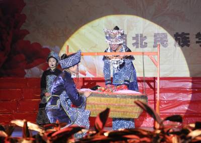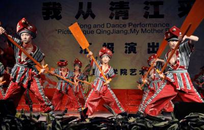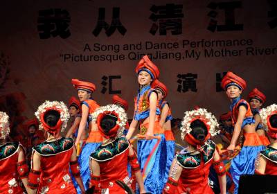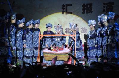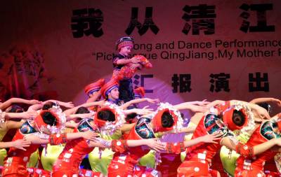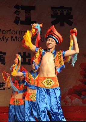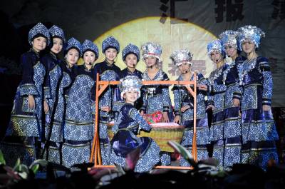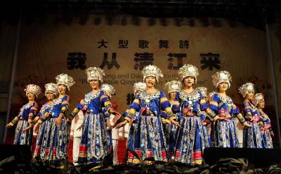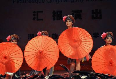 12月16日,湖北民族学院大学生在表演大型歌舞诗剧《我从清江来》。 《我从清江来》大型歌舞诗剧是以土家族大迁徙为引子,以土家族、苗族的诞生为切入点,讲述一个土家族青年从出生到长大成才,再回到家乡为家乡教育事业做出贡献的故事。《我从清江来》大型歌舞诗剧分《欢腾的苗寨》、《土苗学子情》、《哭嫁歌》、《敬酒歌》、《清江,握住我的手》等篇章,全方位展示土家族、苗族的风土人情。