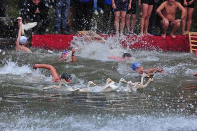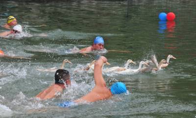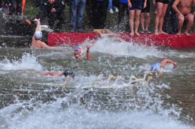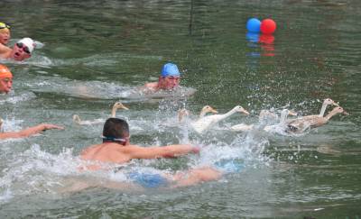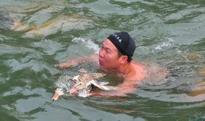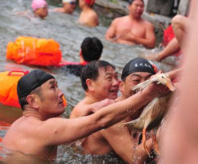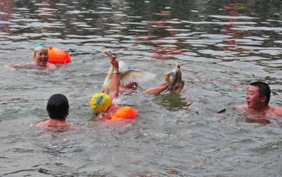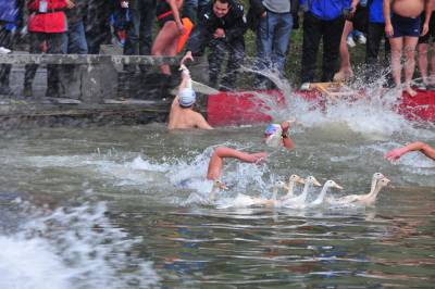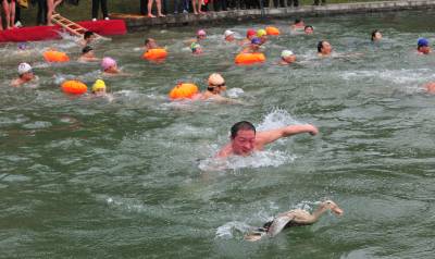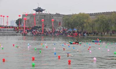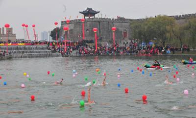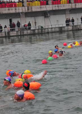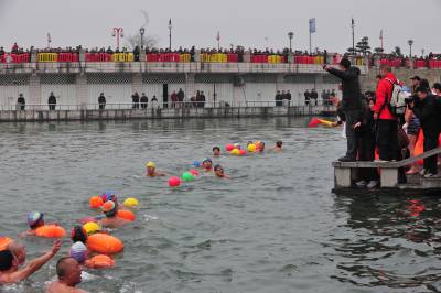 12月17日,来国内18个省市的65支代表队的2000多名冬泳爱好者在湖北省襄阳市参加冬泳文化节。冬泳文化节期间,除了今日上午举行千人畅游汉江、横渡汉江铁人两项、盛装下水等比赛外,下午还将在护城河夫人城段举行水中拔河、冰水马拉松、水中抓鸭子等趣味比赛,18日将举办书法大赛和招商推介会。
