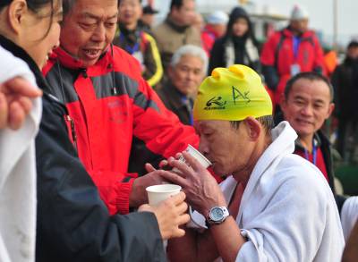 2011年12月17日2000多名冬泳好手齐聚襄阳参加全国第三届冬泳文化节,在凌冽的北风中畅游汉江。当日,来自全国18个省市的65支代表队从古城墙脚下钻入汉江,迎着风浪畅游到北岸的樊城。这项活动吸引了汉江两岸大量市民参观,他们纷纷为冬泳健儿鼓掌加油。 本报视界网 谢勇 摄