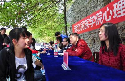 4月19日中午,大学生在校园流动心理咨询服务台进行心理咨询。为缓解在校大学生心理压力,关注大学生的心理健康,当月,恩施湖北民族学院开展以“阳光心灵,成长你我”为主题第六届心理健康月活动,通过邀请学校心理健康咨询师和返校的优秀毕业生,为在校大学生解决考研、考公务员等引起的心理健康问题。