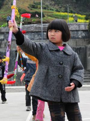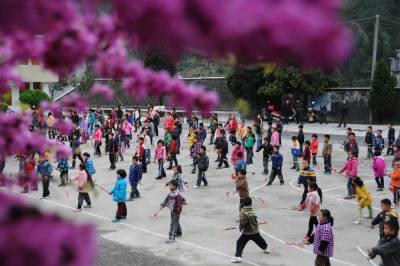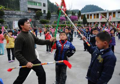 4月18日,宣恩县高罗乡板寮小学学生正在课间操时间表演“滚龙莲湘”。滚龙莲湘是宣恩的传统民间艺术,2009年被列入第二批省级非物质文化遗产名录。为使这项文化遗产得以传承,宣恩县部分学校将其作为一门课程,为学生制作了道具,并安排专门教师进行传授指导,将平常课间操时间的广播体操变成“滚龙莲湘”表演,既让学生们了解、感受“非遗”文化的艺术魅力,为非物质文化遗产的传承培养“小传人”,又增强了学生的体育锻炼。 签约摄影师 李以国 摄
