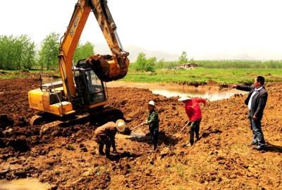 种粮大户徐犹钱(右一)正在指挥农民翻耕海口湖港沟渠草地。